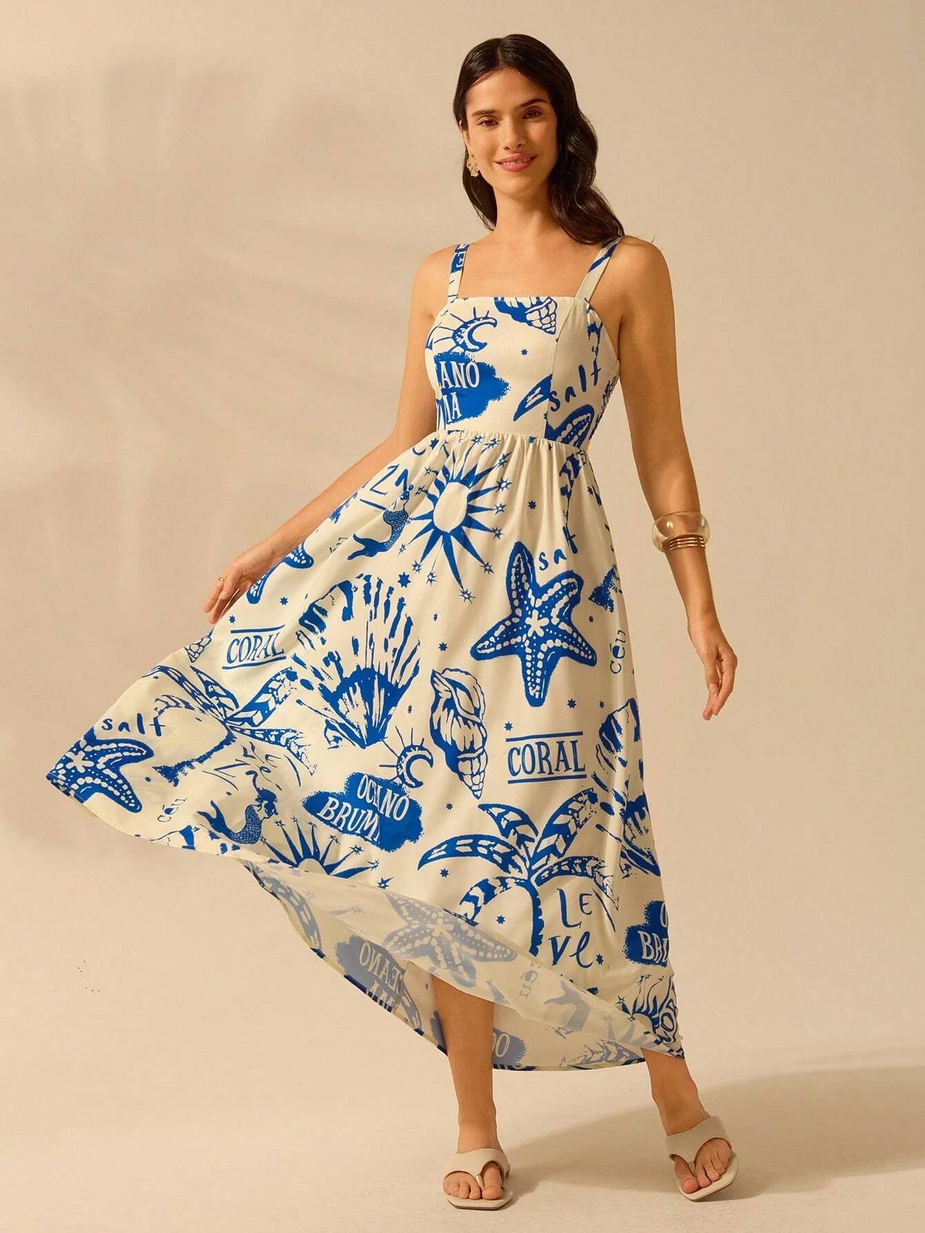 O Vestido Longo Boho combina estilo descontraído e elegância, perfeito para dias de verão e férias tropicais. Com estampa colorida de palmeiras e design moderno, é ideal para compor looks leves e sofisticados.