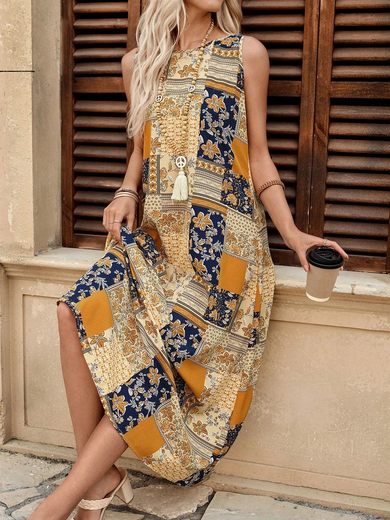O Vestido Longo Boho Estampado é ideal para o verão, trazendo conforto e estilo. Com uma charmosa estampa de retalhos, tribal e floral, ele combina uma modelagem leve com detalhes funcionais, como bolsos.