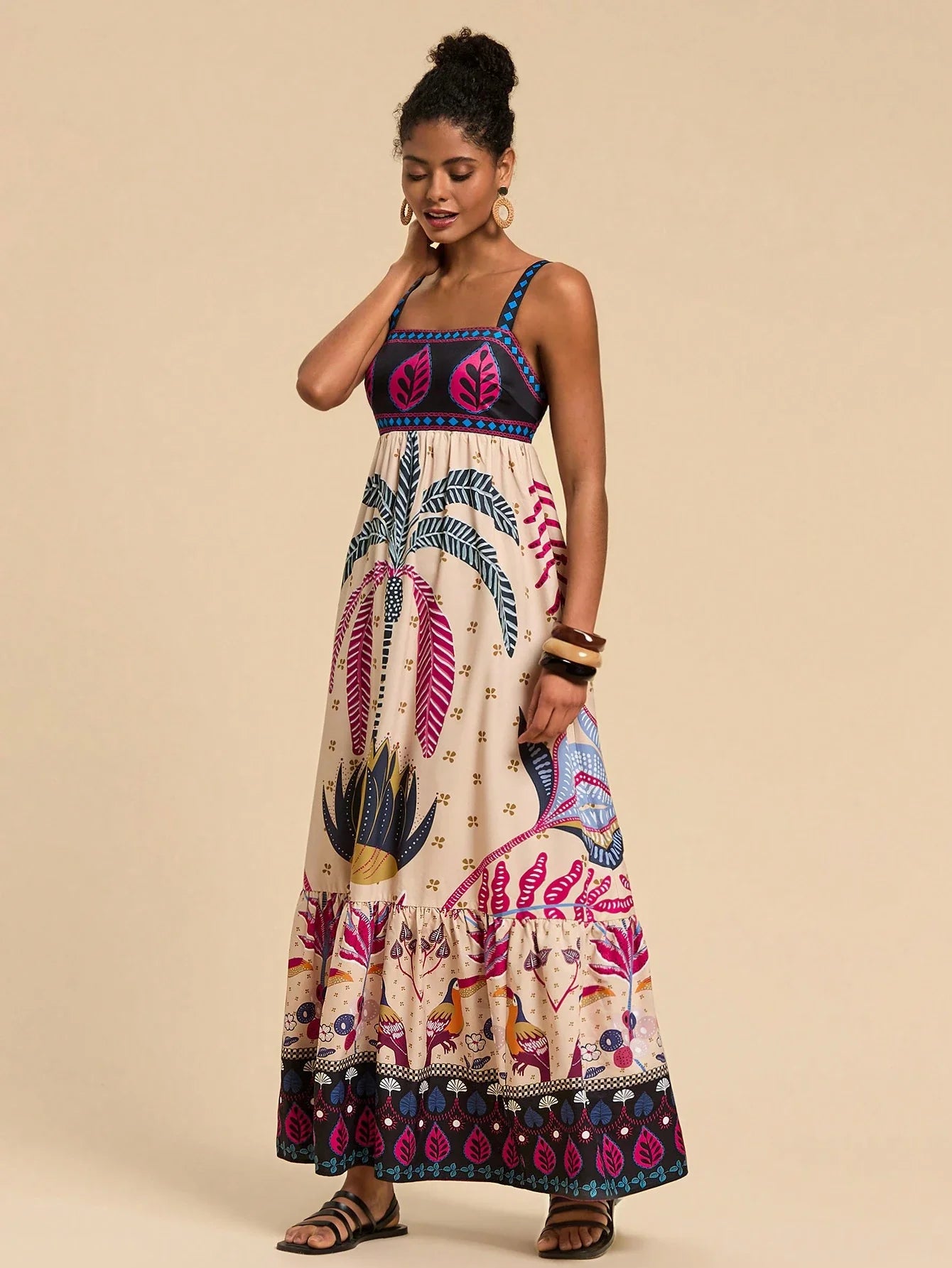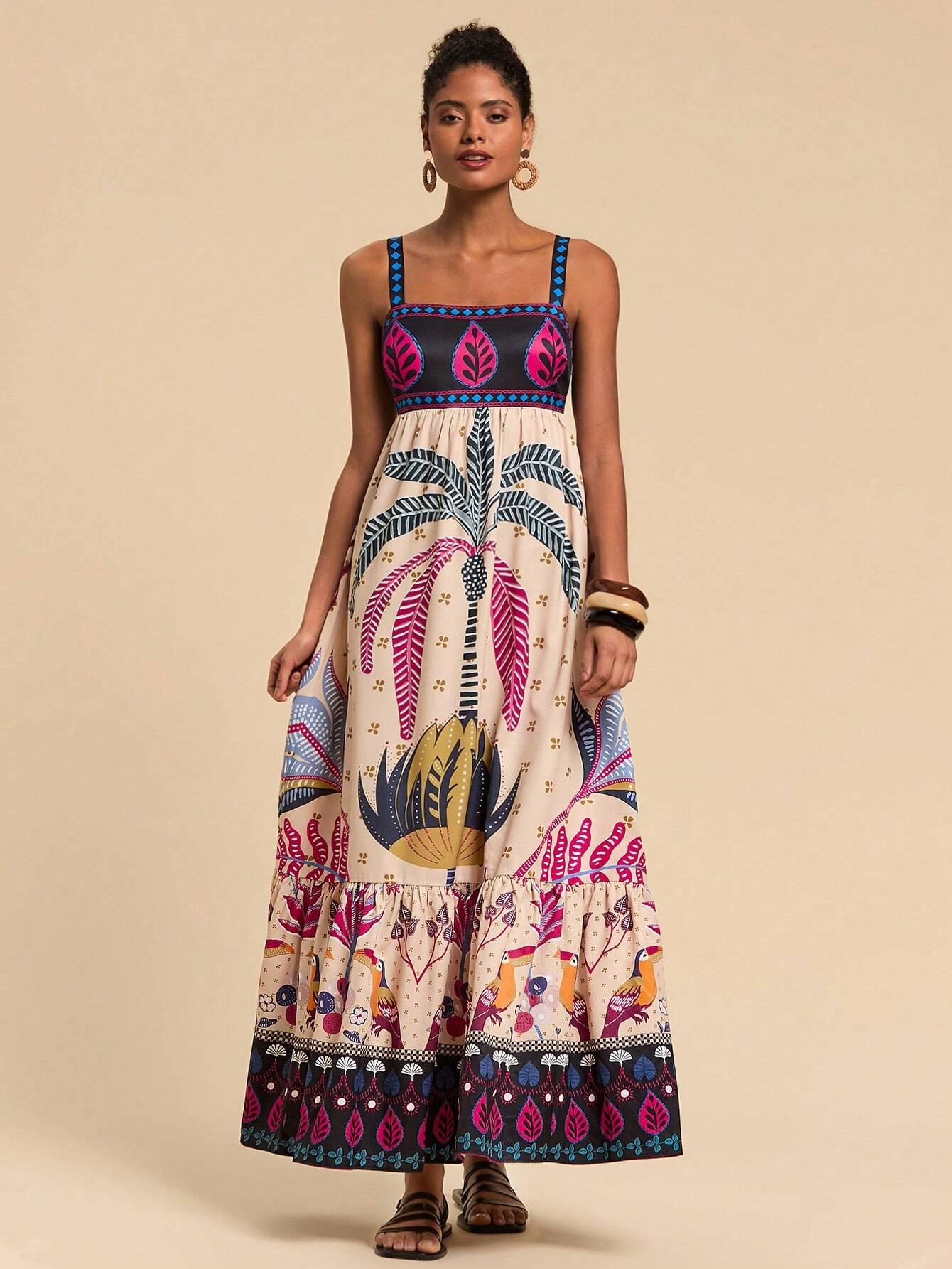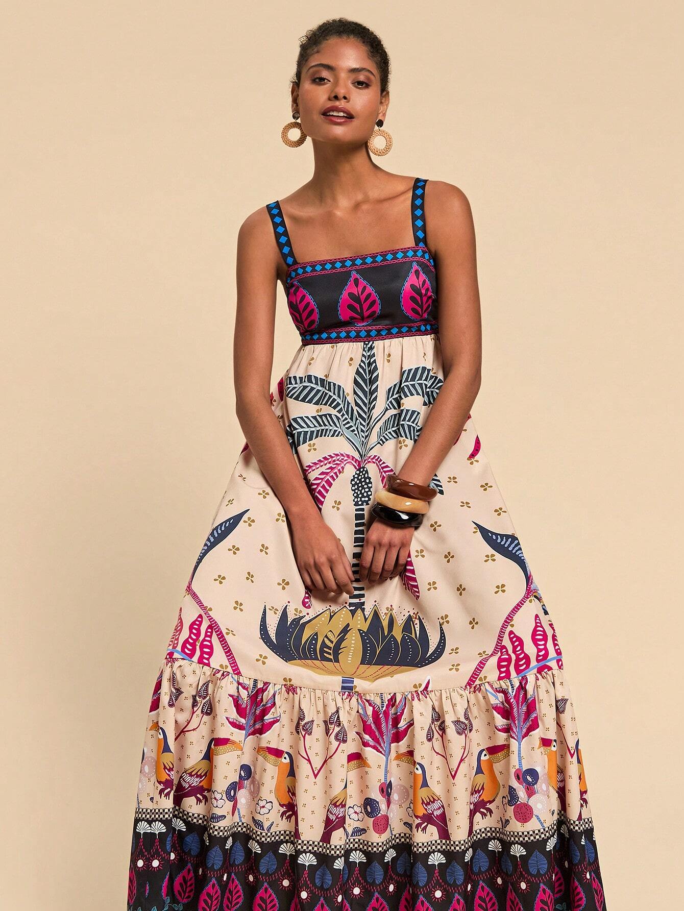 O Vestido Longo Tropical é perfeito para momentos descontraídos e dias ensolarados. Com estampa tribal e de plantas, alças grossas e bainha esvoaçante com babados, ele oferece um visual leve e elegante para férias e ocasiões casuais.