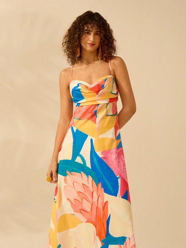 Vestido Longo de Slip Casual de Férias com Estampa Tropical Boêmia