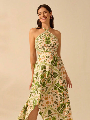 Vestido Longo de Verão com Estampa Tropical e Decote Halter